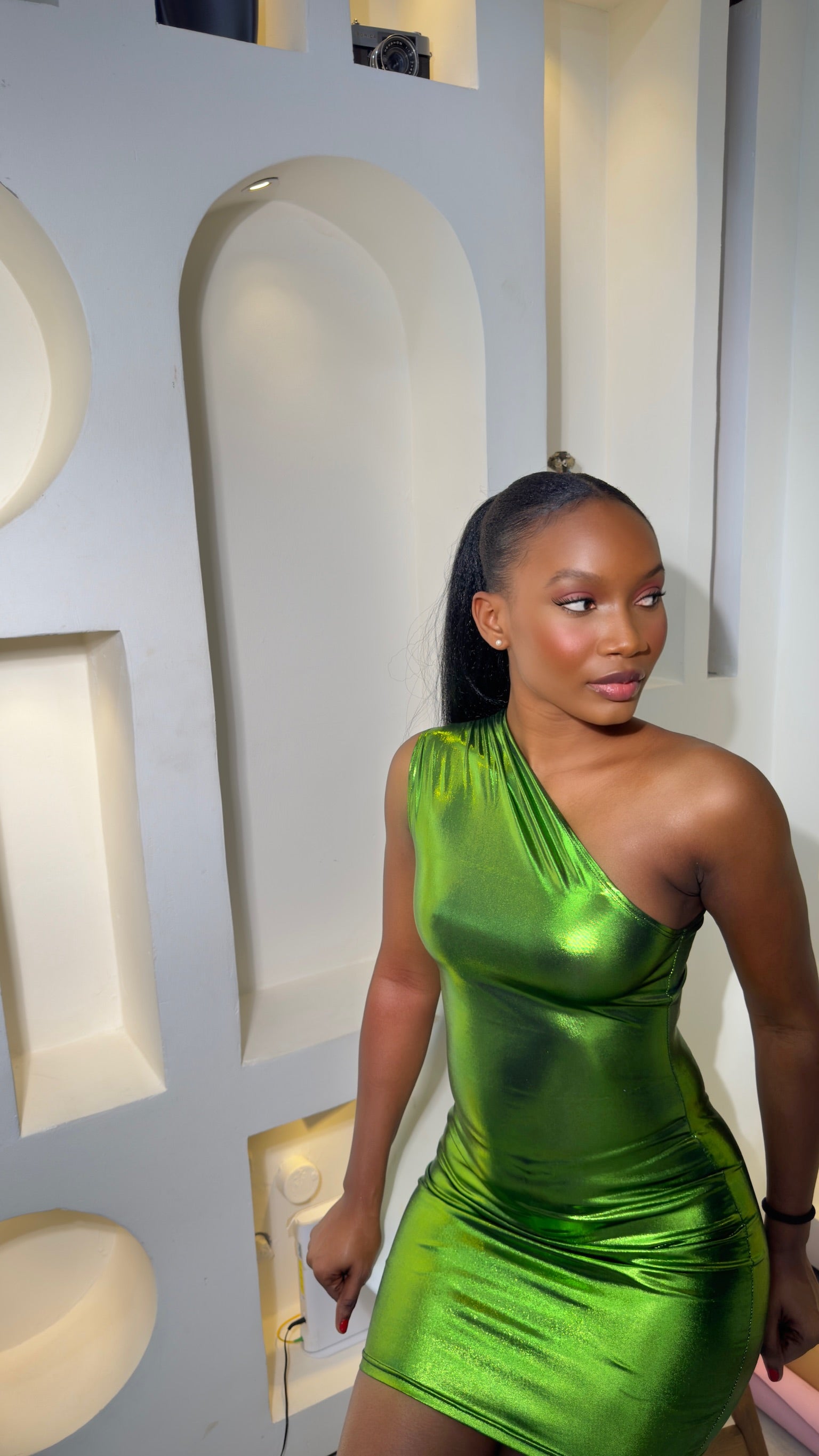 Shimmer in style with this curve-hugging, metallic emerald mini. Features a sleek one-shoulder design, high-stretch fit, and a bold, night-out ready vibe.